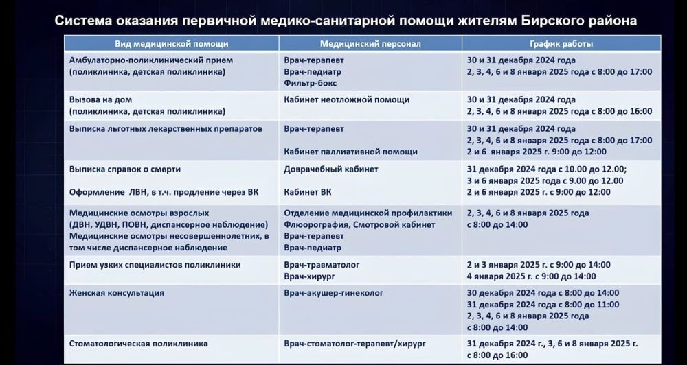 Сегодня, 24 декабря, главный врач Бирской центральной районной больницы, Хаматов Айдар Ралифович, принял участие в совещании, прошедшем в администрации муниципального района Бирский район. В ходе совещания он подробно рассказал о том, как медицинское учреждение будет функционировать в период новогодних праздников.